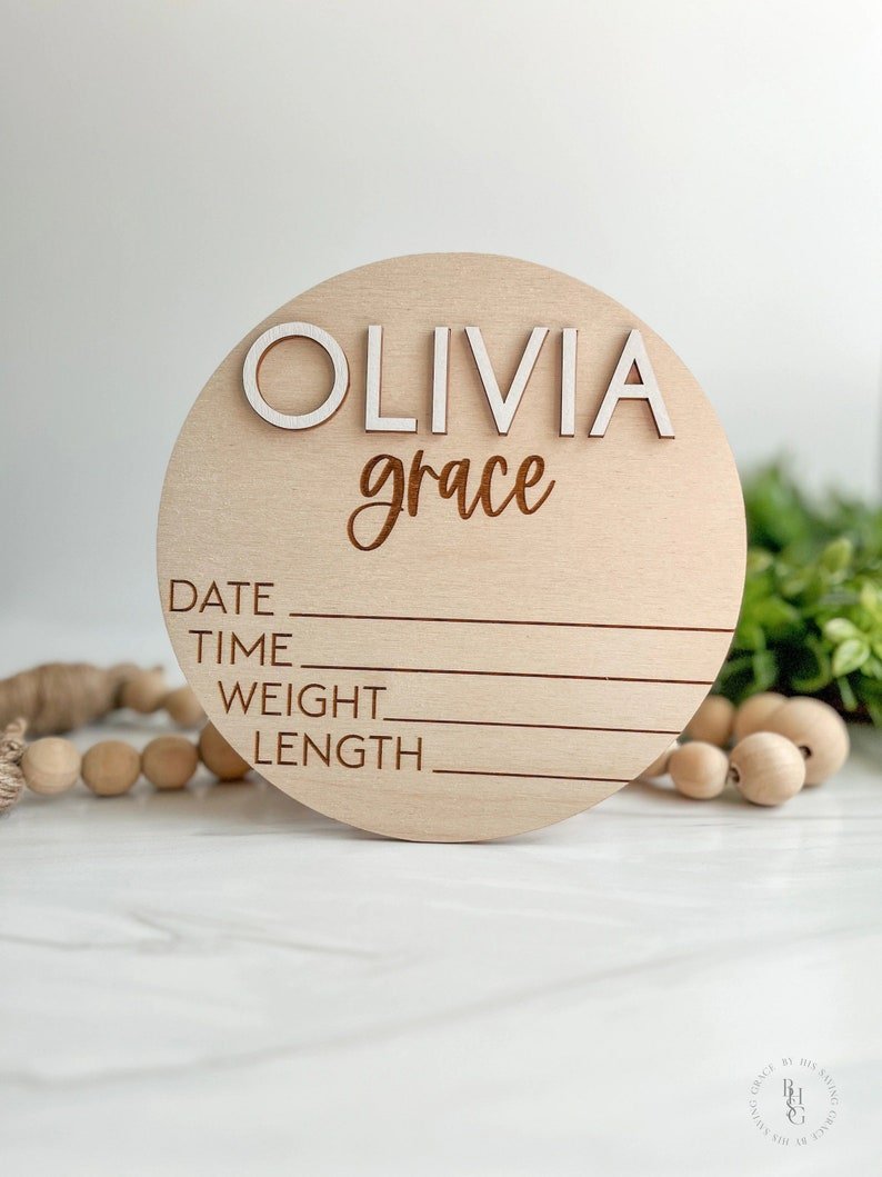 Our Baby Announcement Sign With Birth Stats | Wood Sign for Name Reveal is the perfect way to introduce your newborn to family and friends. Crafted from premium wood and designed with love, this custom disc includes your baby’s name, date of birth, weight, and length, making it an unforgettable keepsake. Ideal for hospital photos, nursery décor, or social media announcements, this wooden sign beautifully captures the joy of welcoming your newest family member.