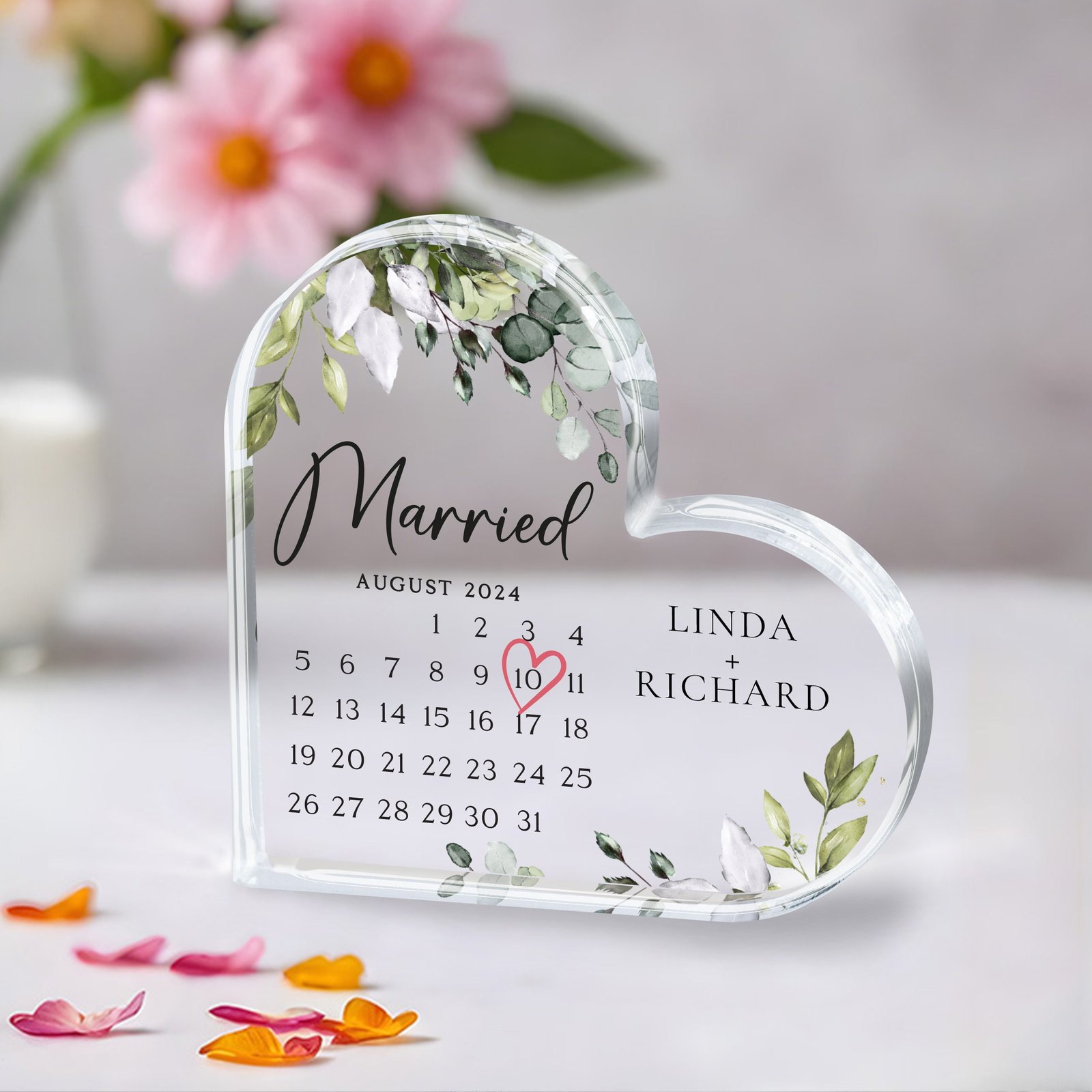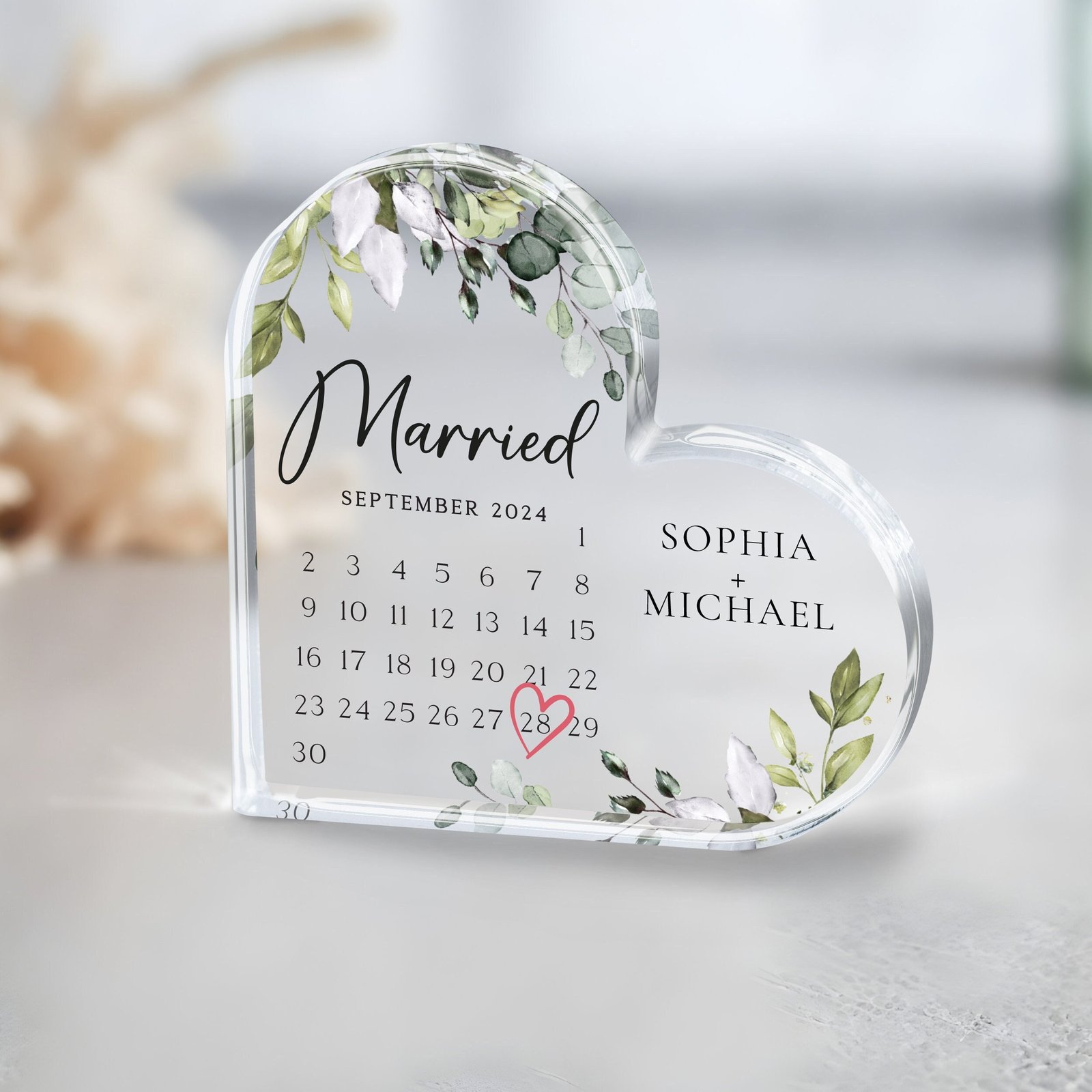 This unique piece showcases a specific calendar month with your chosen date highlighted by a heart or circle icon. Engrave your names, a personal message, and the special date—whether it’s your first date, engagement, wedding, or anniversary. Crafted from crystal-clear acrylic, this stylish memento fits beautifully into any modern décor.