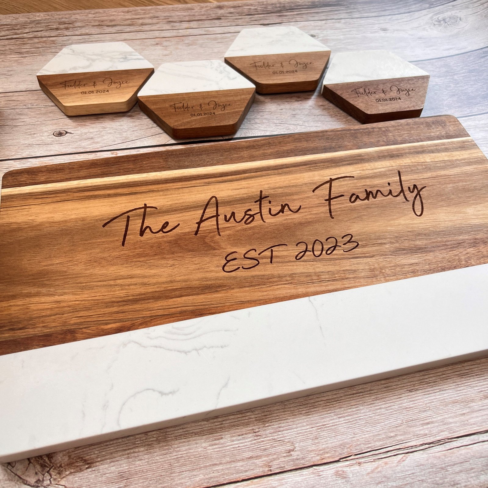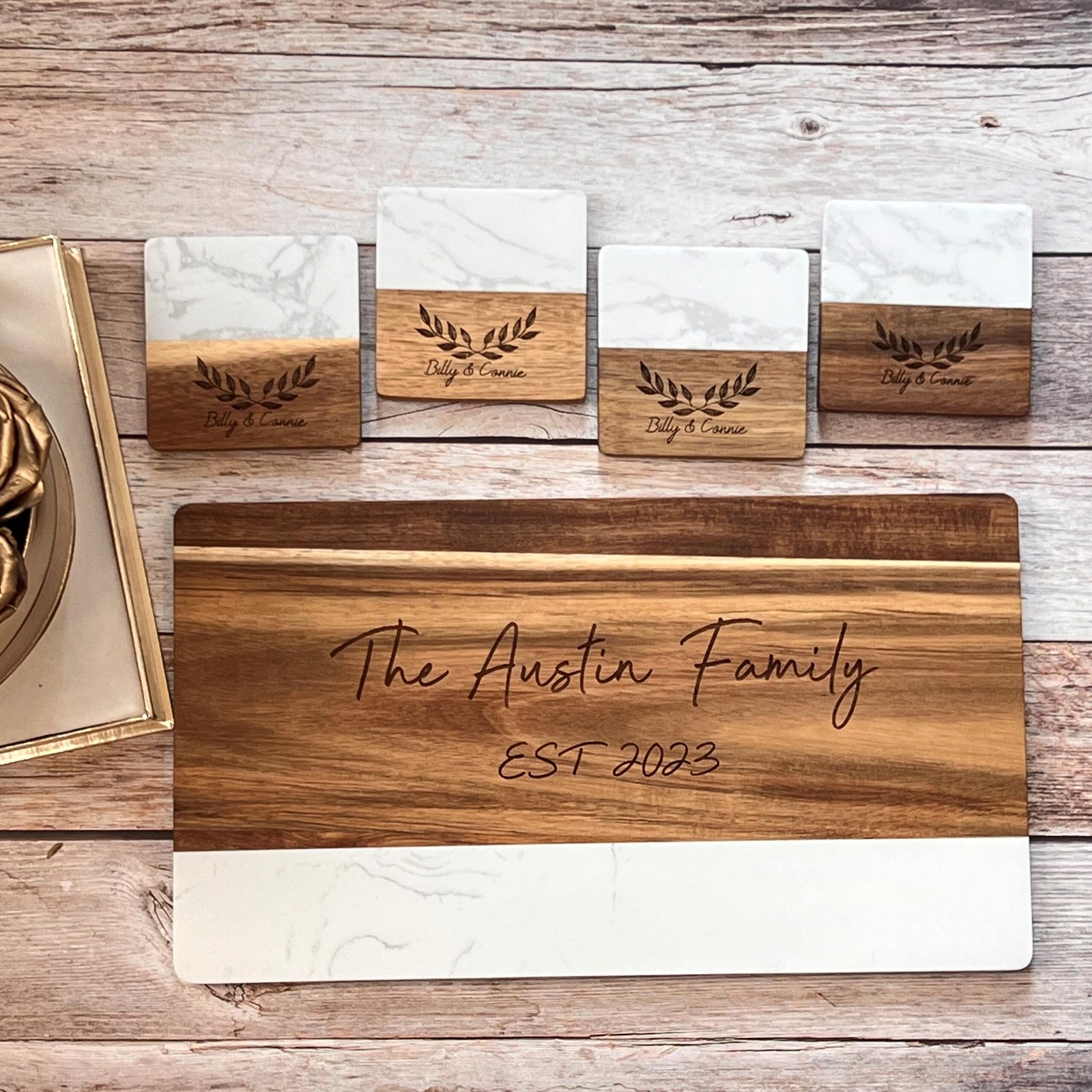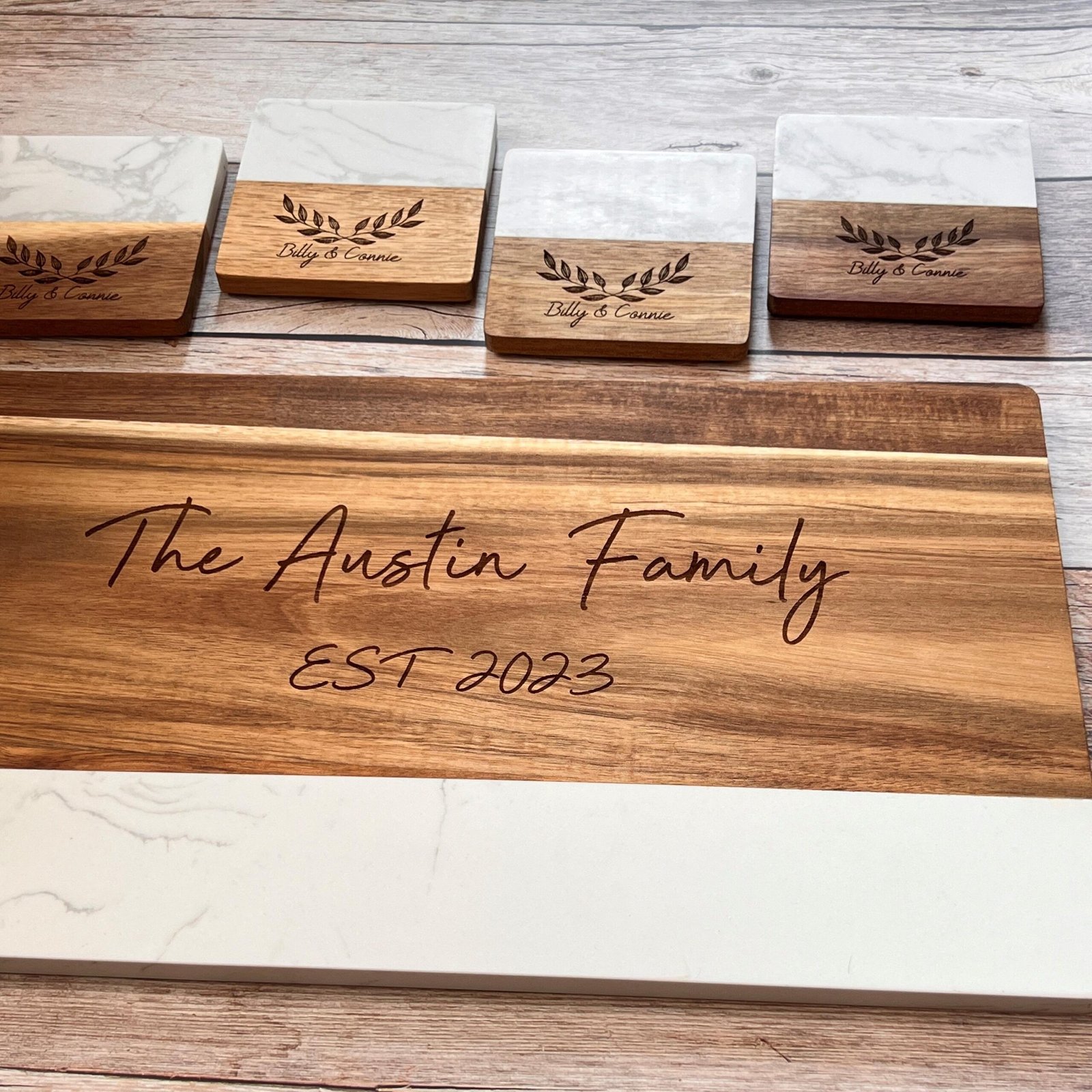 - 🥂 Coordinated Coaster Set Option Pair it with matching custom marble-wood coasters for a complete hosting ensemble.